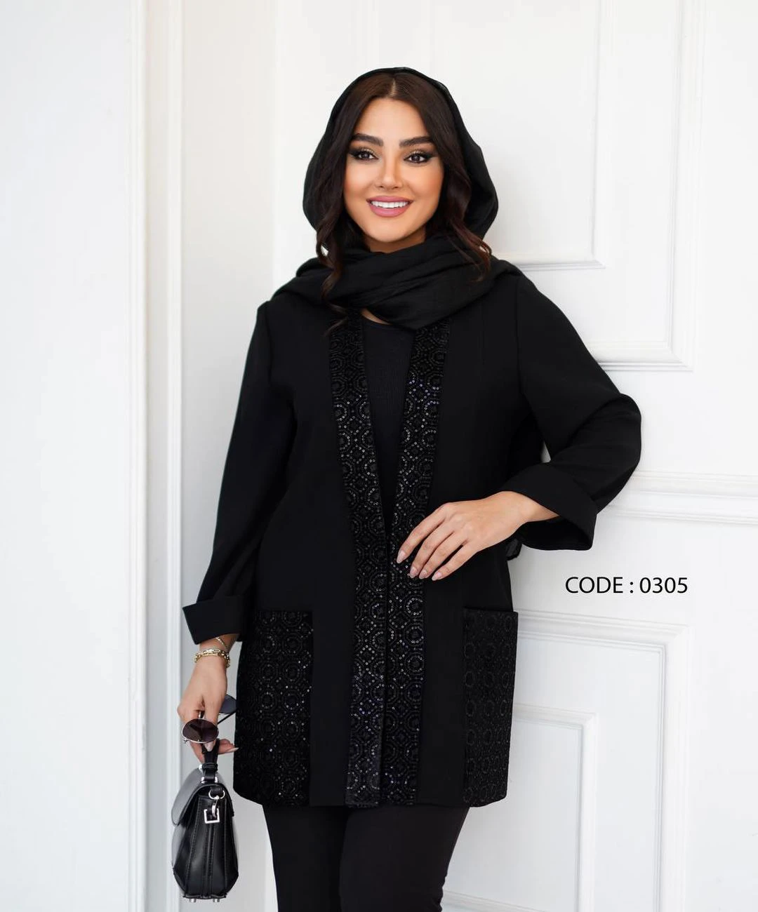 جزییات: طراحی منحصر به فرد با خرجکار مخمل سوزن دوزی بافته شده روی لبه های کت و جیب ها دارای قزن مخفی (تنخور عالی-تضمین کیفیت دوخت مزونی )