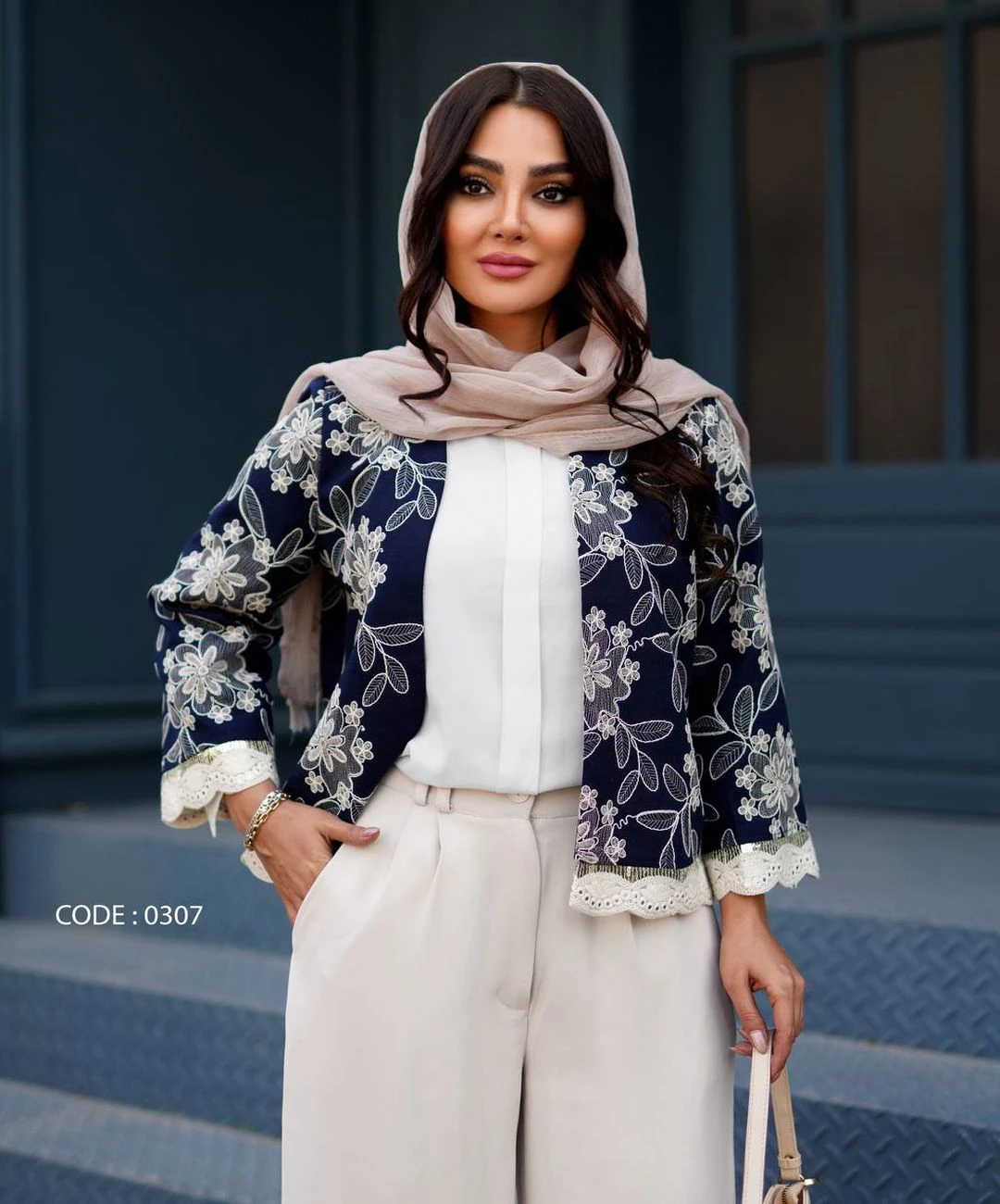 جزییات:تمام سطح پارچه با طرحهای شکوفه و اسلیمی گلدوزی شده ؛ لبه آستینها و پایین کت با پنلهای مجلل هندی (ترکیب آینهدوزی ماشینی، پولکدوزی طلایی و خامهدوزی برجسته) تزیین شده است.